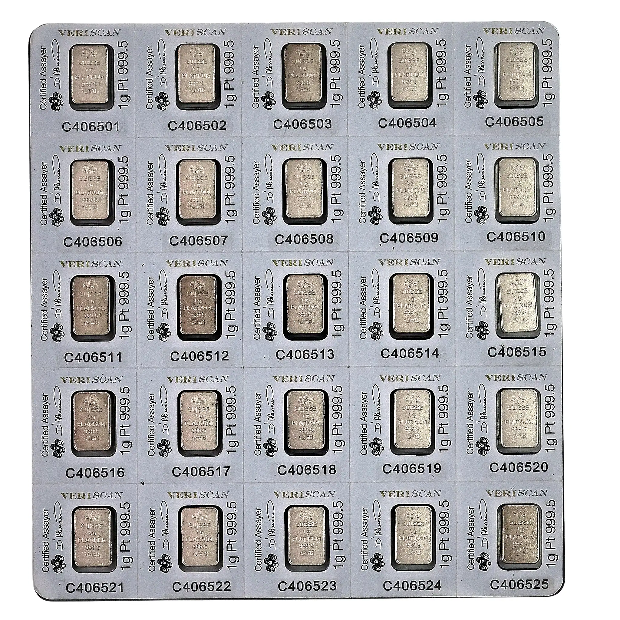 These are stunning 1 gram PAMP Suisse platinum bars weighing in at a total of25 grams of platinum. Known for its exceptional quality and purity of .999, this collection of bars is a favorite among investors and collectors alike. Each bar features the iconic PAMP Suisse design, which includes the image of the goddess Fortuna, symbolizing luck and prosperity.